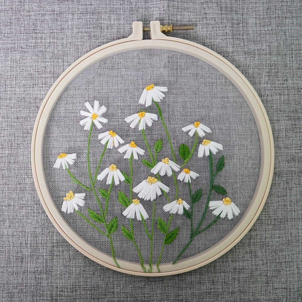 1. kit de iniciantes do bordado, incluindo todas as ferramentas necessárias: pano impresso do bordado, linha do bordado, quadro do bordado, agulha do bordado, manual de instruções.